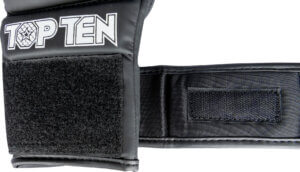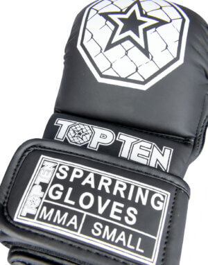 Die MMA Sparringhandschuhe „Contender“ von TOP TEN eignen sich für Amateur-Wettkämpfe und den anspruchsvollen Trainingsalltag aller Leistungsstufen. Die robusten Kunstleder-Handschuhe weisen die typische offene Fingerführung und ein zusätzliches Padding auf das Verletzungen im Training verhindert.
